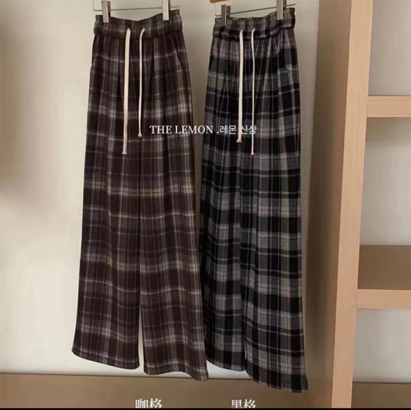 2383最近风很大!复古加绒格纹抽绳拖地裤不退换