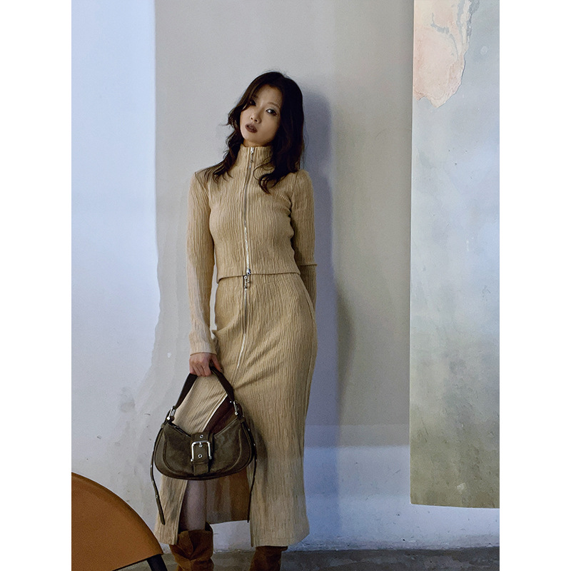 设计师女装 无敌显瘦可盐可甜羊毛棉混纺拉链立领针织树皮皱开衫