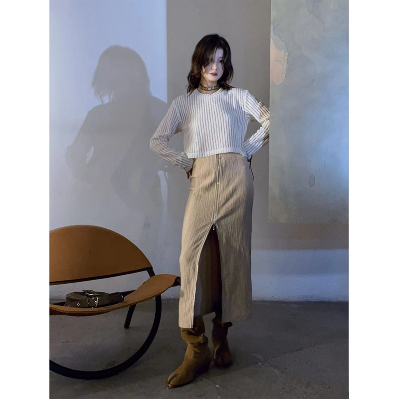 设计师女装 进口提花坑条羊毛混纺百搭长袖衫