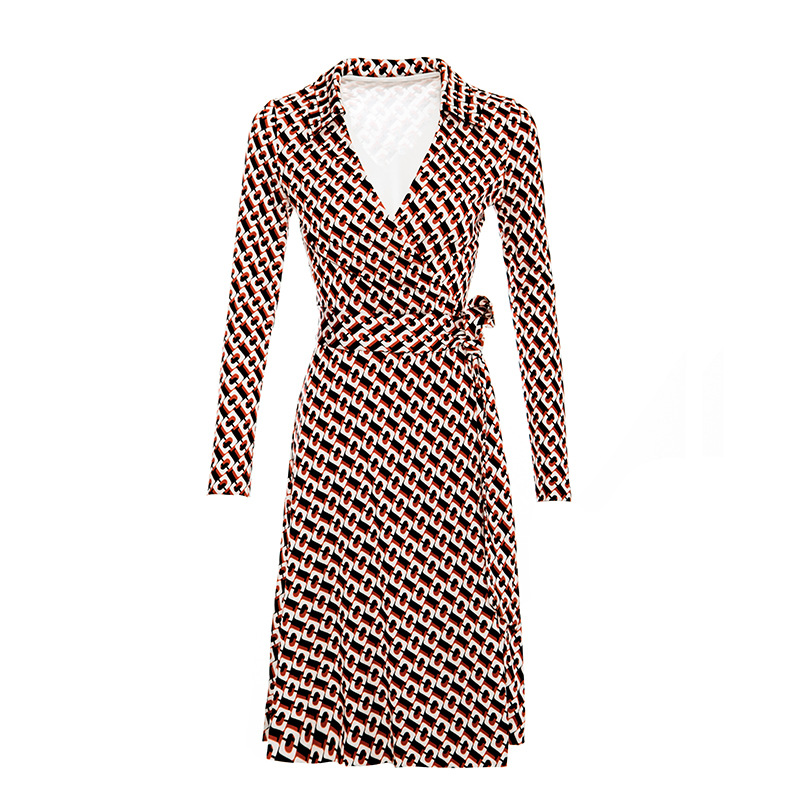 XSHM DVF新款夏季锁链印花长袖裹身裙一片式连衣裙V领气质