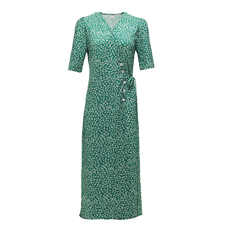 XSHM DVF夏季法式花瓣碎花裹身裙复古V领系带修身中长款连衣裙女