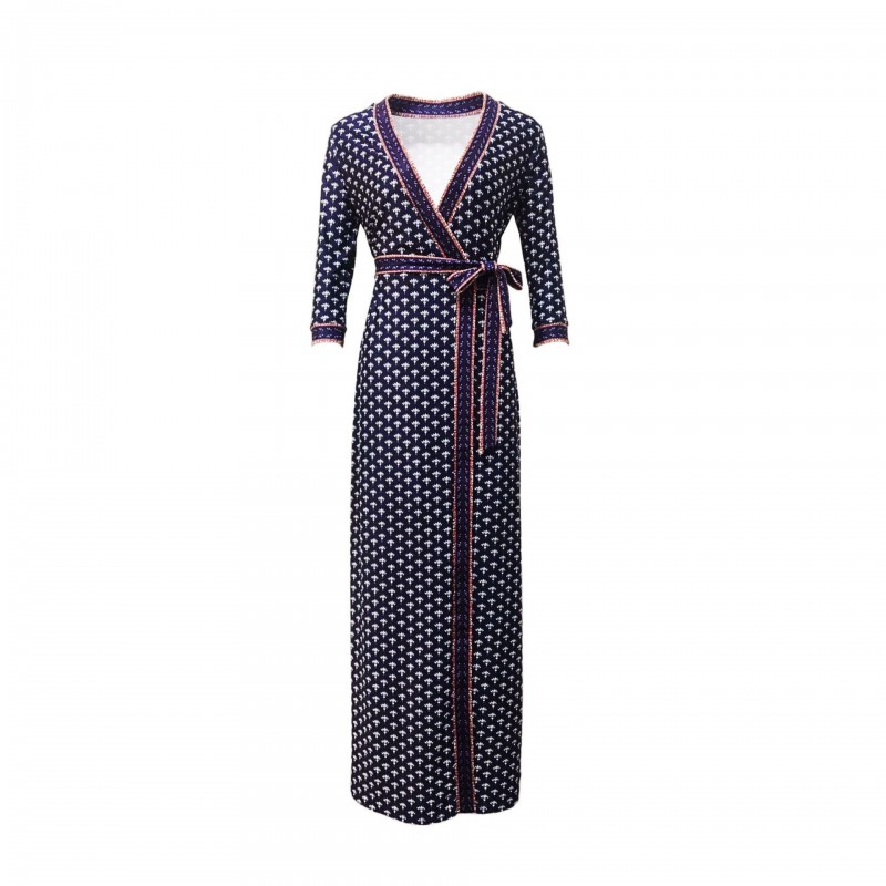 新款裹身裙夏季时尚修身蓝色小雏菊长款七分袖系带性感开叉连衣裙