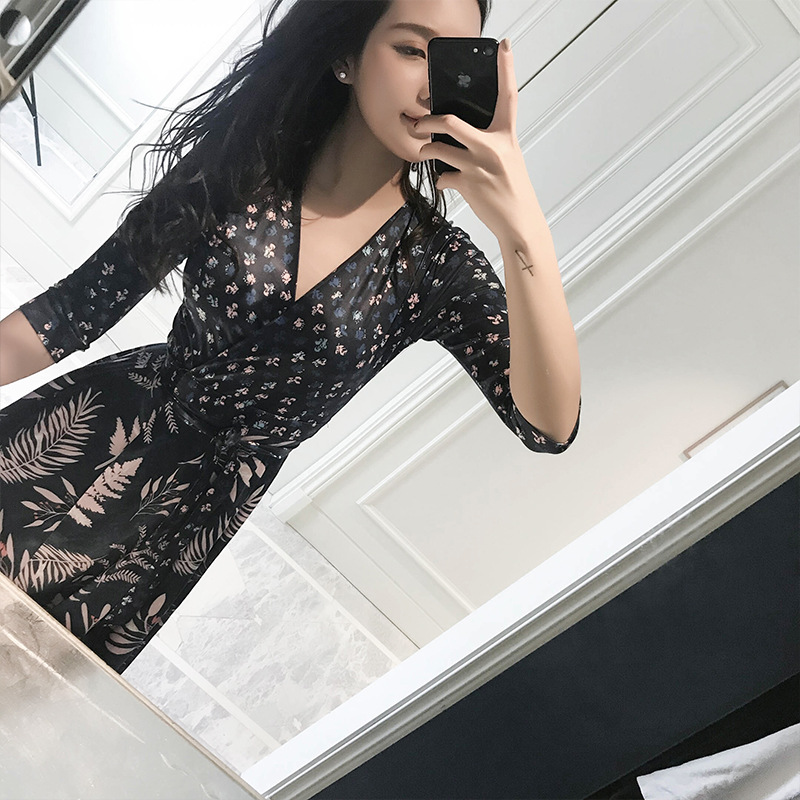 XSHM DVF夏季女装韩版百叶草印花度假裹身裙系带修身显瘦连衣裙女