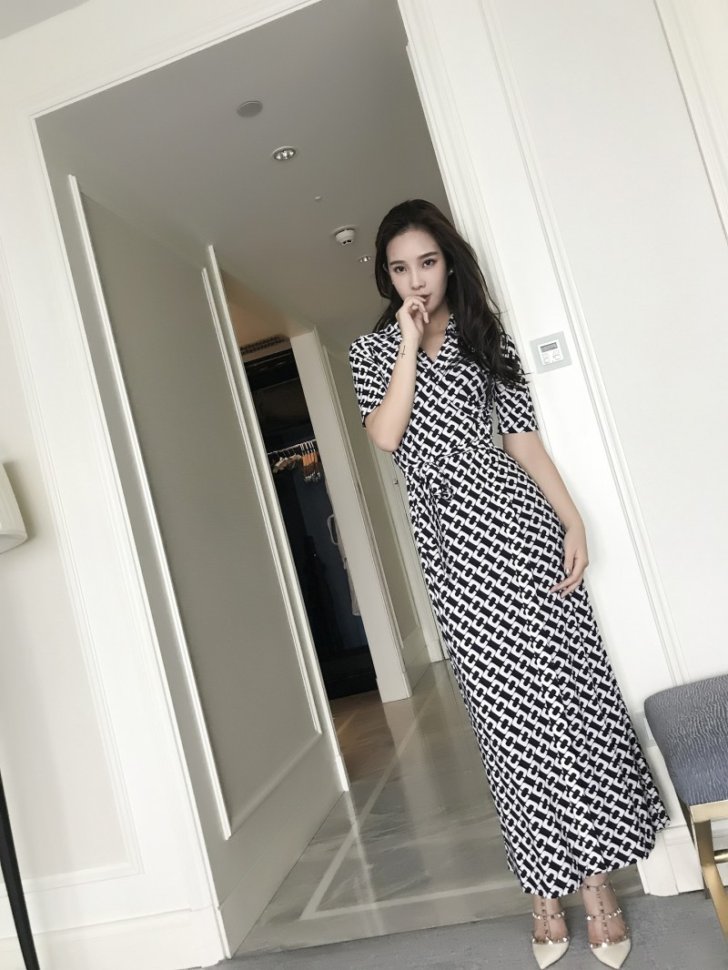 夏季新品一片式长款D家同款裹身裙锁链印花V领系带气质连衣裙女