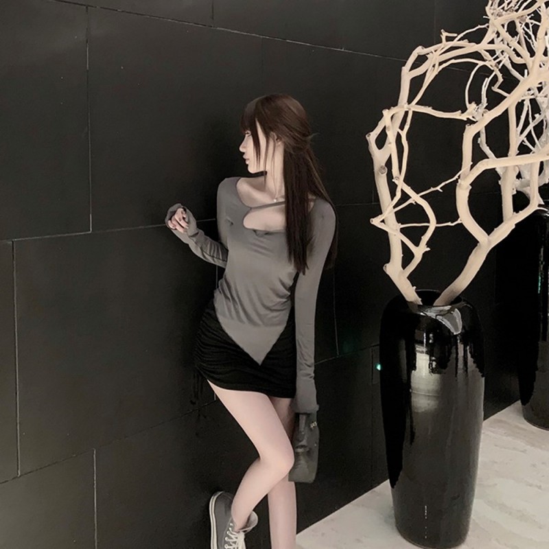 纯欲风显身材一根带子长袖修身紧身T恤套头百搭tee上衣女