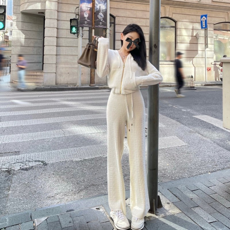 2021时尚女装连帽开衫外套+阔腿长裤白色针织套装