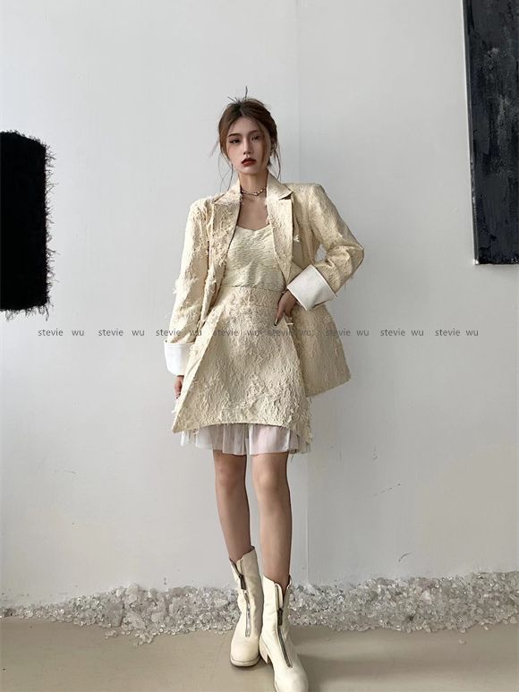 steviewu飘·系列复古流苏提花翻袖西装下摆拼纱两件套女气质套装
