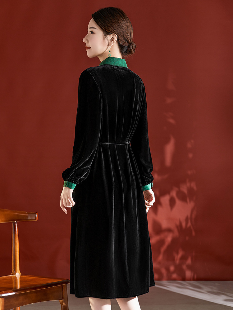 真丝丝绒连衣裙轻奢长袖翻领拼接气质新款女士妈妈装桑蚕丝长裙