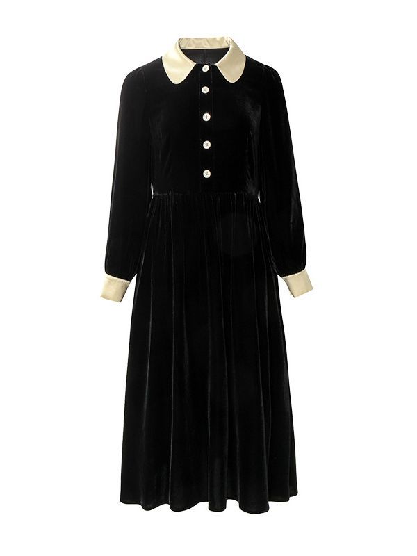 真丝丝绒连衣裙女2023新款秋冬娃娃领拼接长袖收腰桑蚕丝长裙