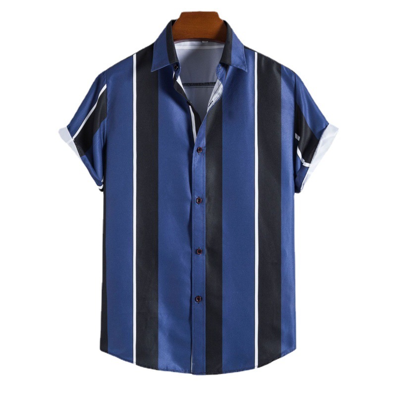 2023跨境外贸新款男士条纹短袖衬衫欧码时尚印花休闲衬衣男