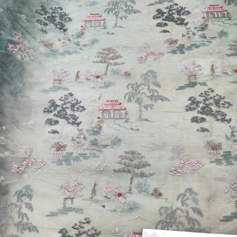 国风欧根纱染色旗袍汉服马面裙时装布料机绣亭台楼阁服装绣花面料