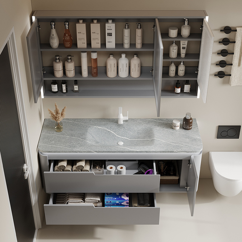2023新款奶油风浴室柜组合岩板热弯陶瓷一体盆卫生间洗漱台洗手盆