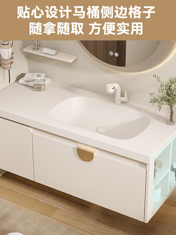 杜邦可丽耐一体盆奶油风浴室柜组合实木现代简约侧面收纳洗手脸盆