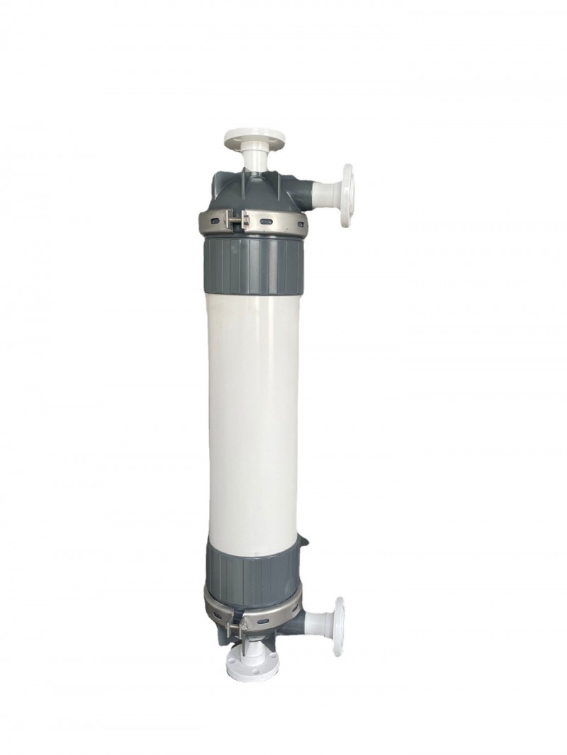 气液膜接触器工作原理:液体在中空纤维膜丝一侧流动,在膜丝另一侧形成高度真空,由于气体溶解压平衡破坏,溶解在液体中气体就会脱溶,透过膜壁,随真空排出,从而达到脱气的目的。