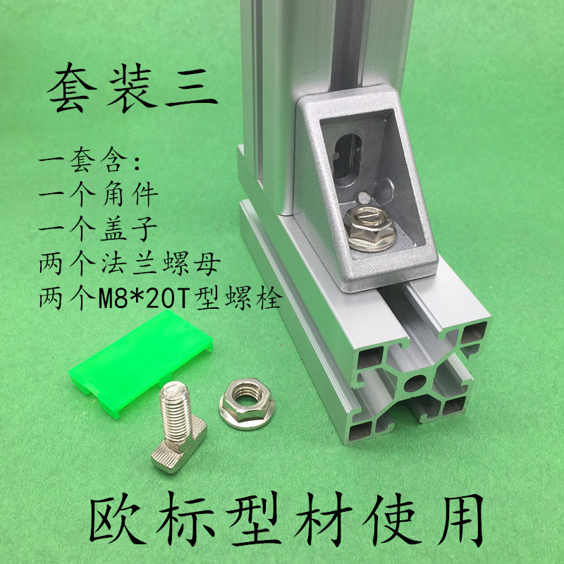 套餐一:螺丝套上平垫后,穿过角件的孔,拧上T型螺母,螺母直接放进型材槽内,旋转90度卡紧,安装方便。