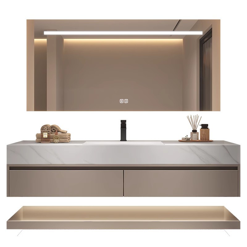 奶油风现代简约酒店双层浴室柜组合岩板无缝陶瓷盆一体式洗脸盆