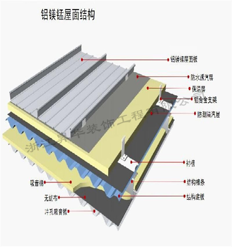 铝镁锰金属屋面板,基于直立锁边咬合设计的特殊金属板型,这种设计主要针对大跨度自支承式密合安装体系。其特点:此压型板表面无须采用螺丝或卡具固定,在板上无穿孔,因铝镁锰板块支承的方式是隐藏在面板之下的。铝镁锰板的连接方式是采用其特有的高强铝合金支架,板与板之间纵向采用直立锁边咬合形成密合的连接,板块的咬合过程无须人力,由机械自动完成。在屋面板与底层钢板之间加入不同的保温及隔声等材料,满足建筑物不同的使用功能。