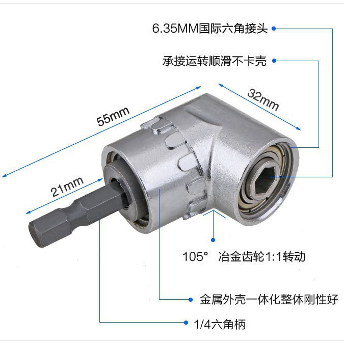 作用:它能连接到电钻,充电电钻或手动扳手,延伸到达至它们无法抵达的狭窄的空间,扭动螺丝,螺帽。