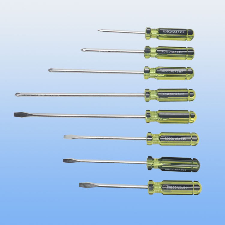 彩条透明柄螺丝刀手柄采用PVC全新料,刀杆为45#钢表面经过无芯磨床电镀高温热处理;也可采用CRV刀杆。头部可以发黑处理!