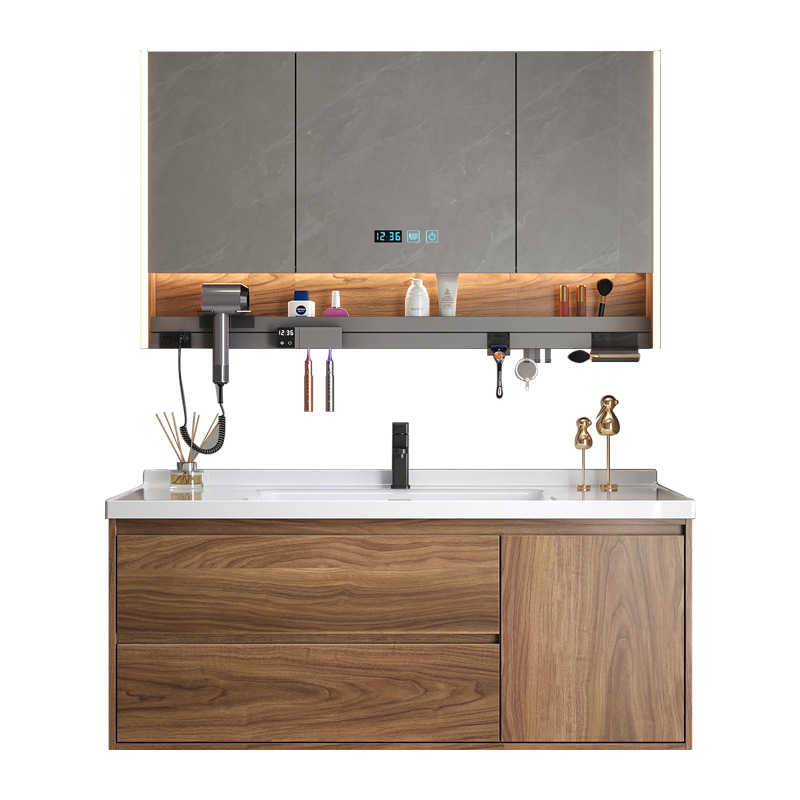 胡桃色陶瓷一体盆实木浴室柜家用卫生间洗漱台厕所洗手洗脸盆组合