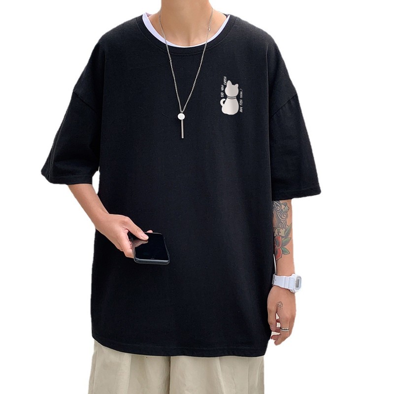 2024夏装新款男士三只猫印花T恤时尚日系宽松型男短袖打底衫潮