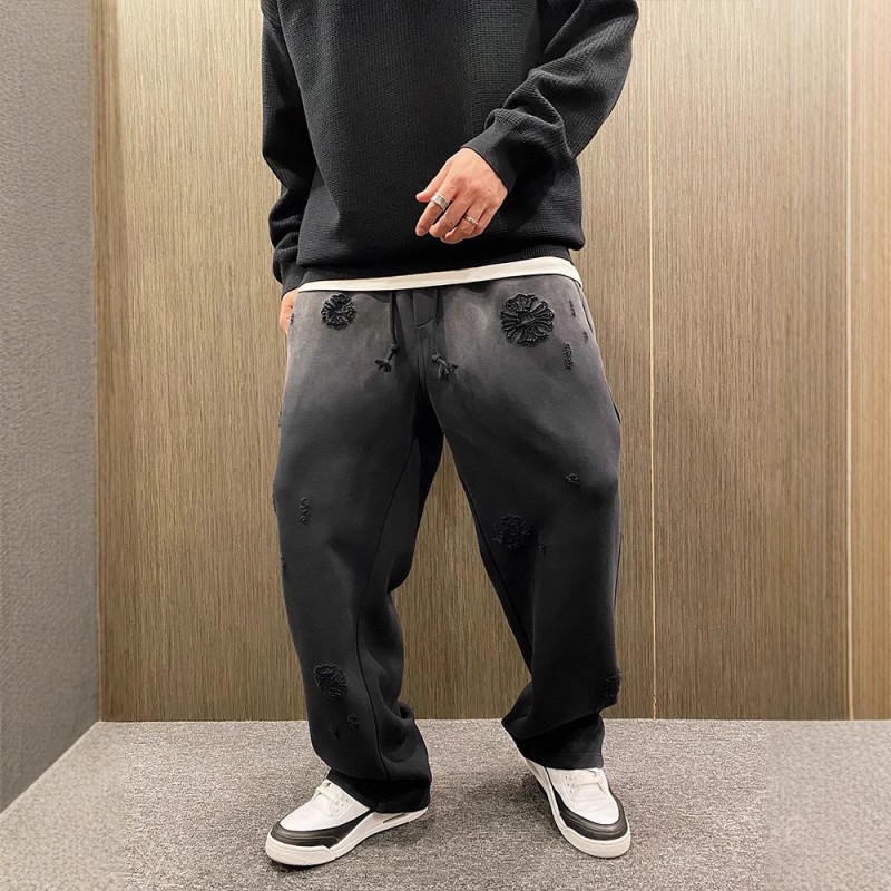 美式潮牌重工刺绣宽松直筒裤男松紧腰抽绳渐变水洗运动卫裤