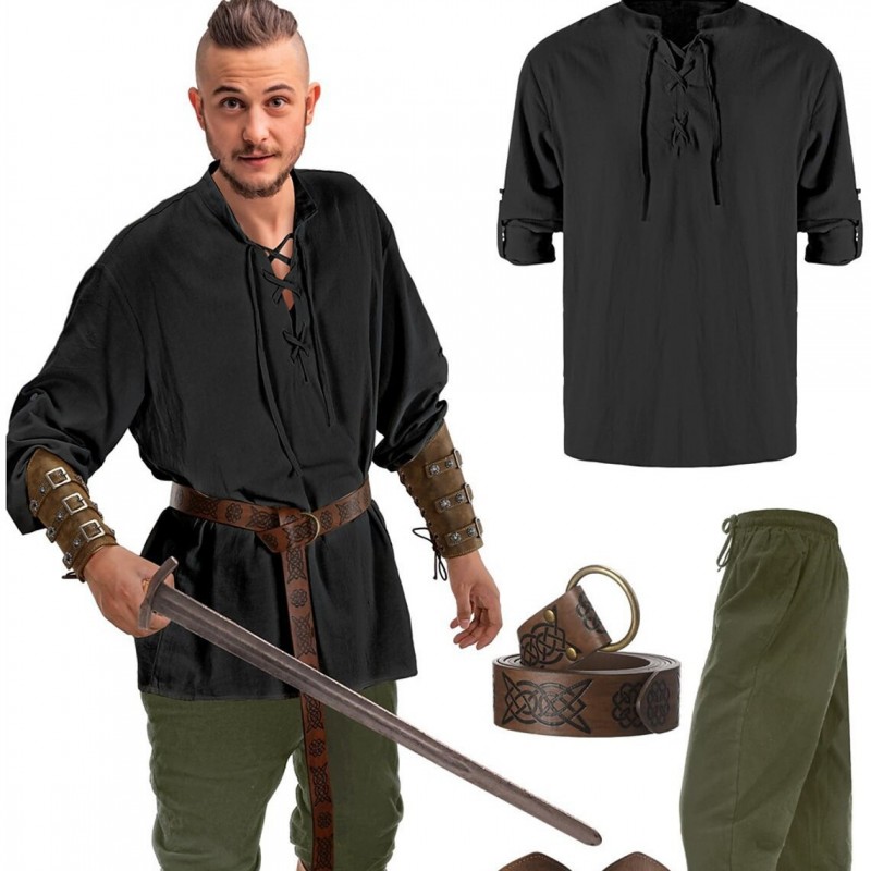 4 件套万圣节男士文艺复兴时期服装套装中世纪海盗衬衫脚踝带状裤
