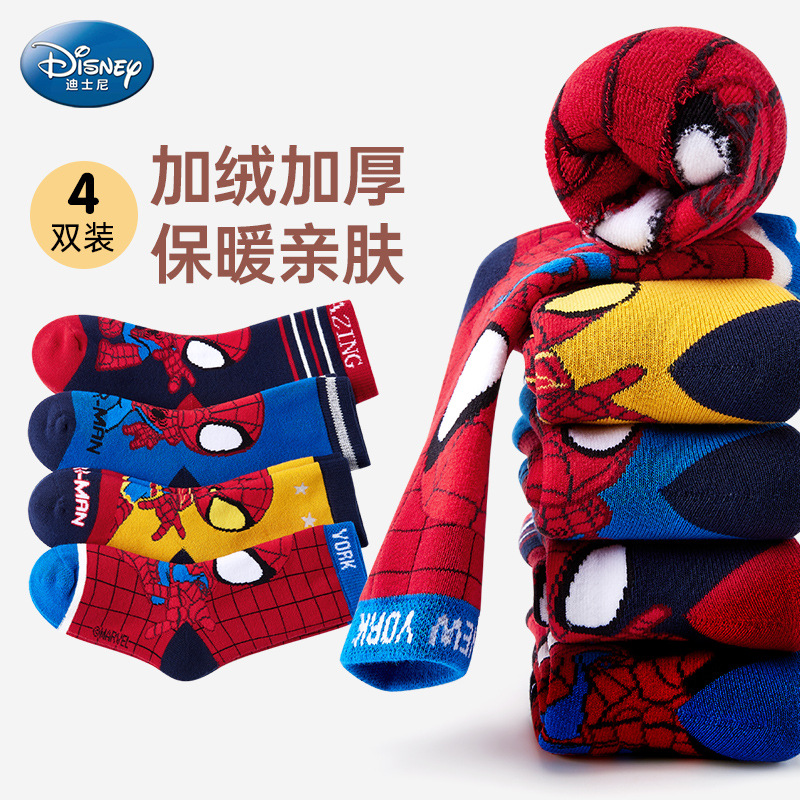 蜘蛛侠4双装加绒毛圈袜男童加厚袜子24冬款儿童7A抑菌中筒袜