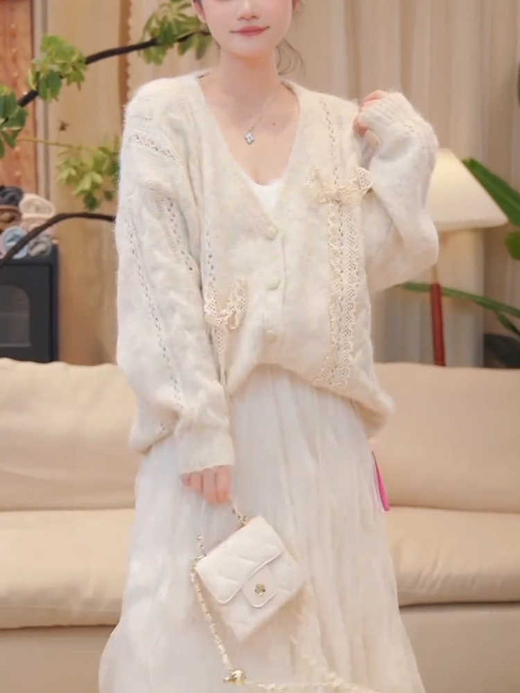 法式蕾丝蝴蝶结杏色开衫毛衣女宽松温柔减龄慵懒风V领针织外套女