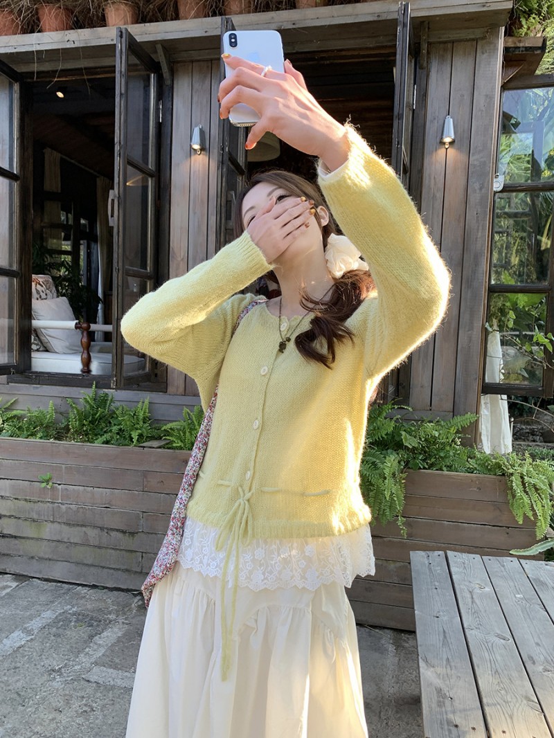 hollyii 韩系温柔甜美百搭花边拼接绑带针织开衫女上衣2025春新款