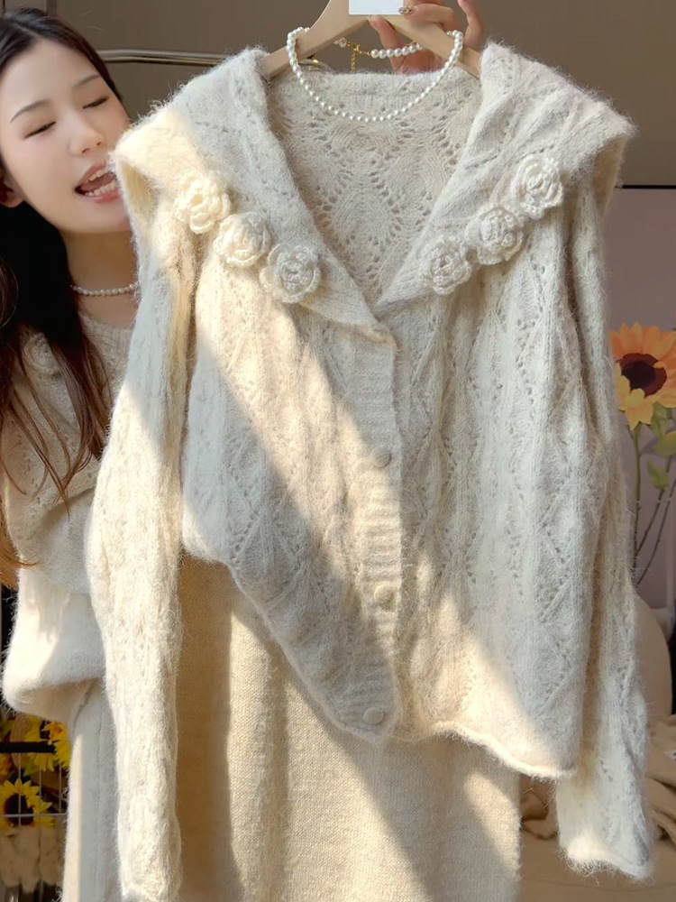 温柔风镂空立体花朵针织开衫毛衣女宽松慵懒别致超好看海军领外套