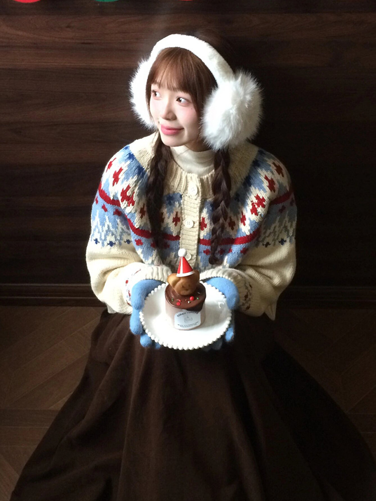 费尔岛毛衣女秋季撞色提花针织开衫宽松加厚外套小众设计感上衣潮