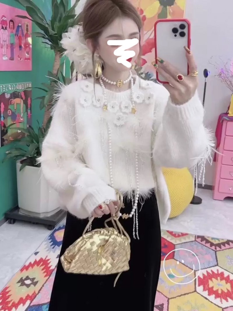 重工新款温柔风圆领套头针织衫女羽毛法式立体花朵宽松慵懒风毛衣