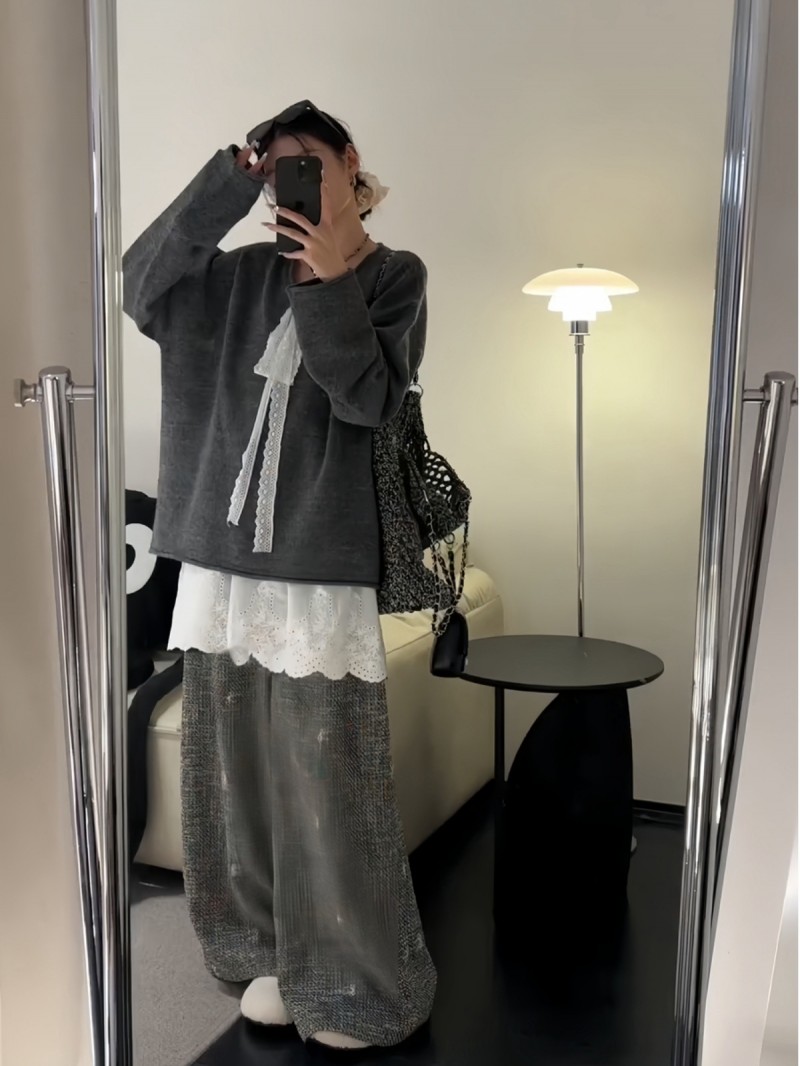 韩国东大门秋季款温时风信子休闲时尚设计V领花边套头针织衫毛衣