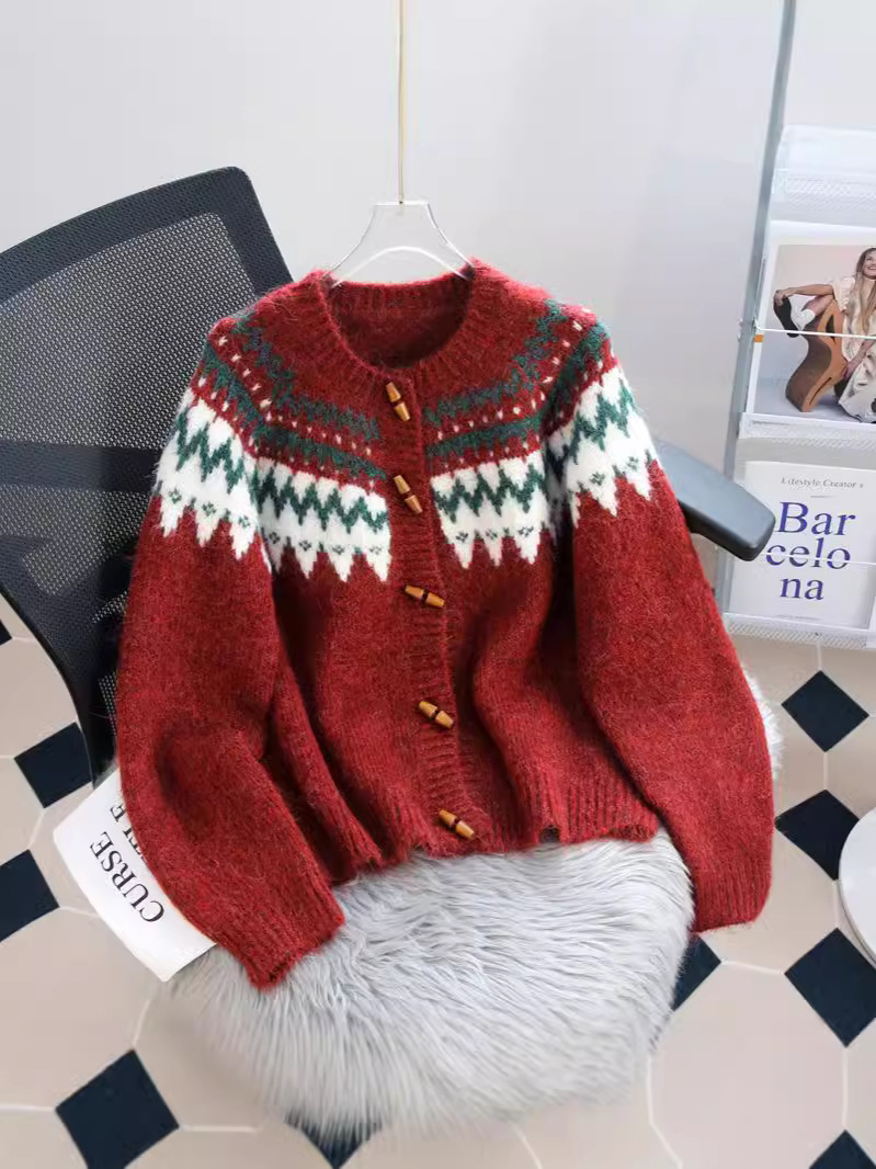 过年红色毛衣外套女2024秋冬季新款慵懒风加厚复古设计感针织开衫