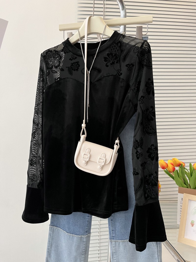 网纱植绒提花金丝绒喇叭袖长袖圆领印花拼接黑色打底衫T恤女上衣