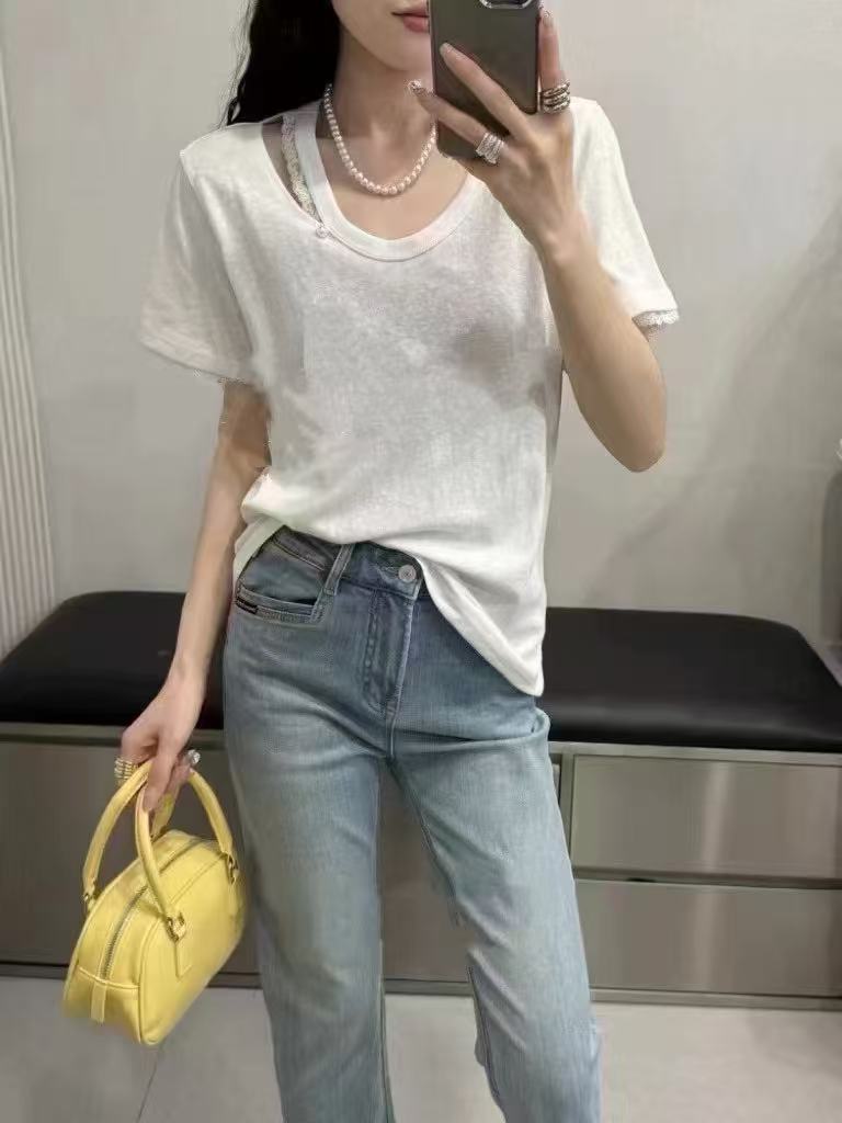 洋气镂空小心机拼接蕾丝短袖T恤女2025春夏新款U领宽松打底衫上衣