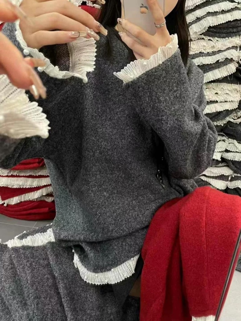 欧洲站2024冬季配瑜伽裤打底V领蕾丝边羊圈卫衣女慵懒风宽松上衣