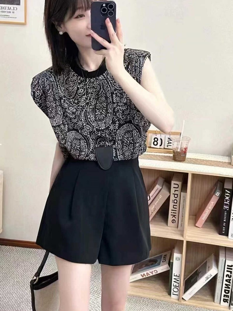 欧洲站2024夏季新款圆领垫肩复古花纹拼色小众无袖套头马甲上衣女