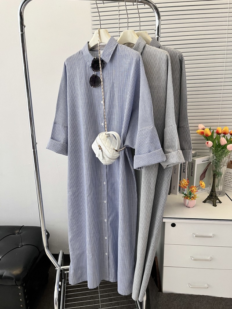 2024跨境速卖通翻领/POLO领条纹气质通勤长袖宽松开衫长款连衣裙