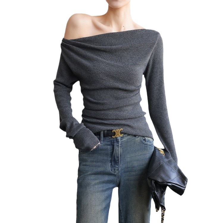 2025秋冬新款修身显瘦打底上衣法式名媛灰色长袖纯色斜肩针织衫女