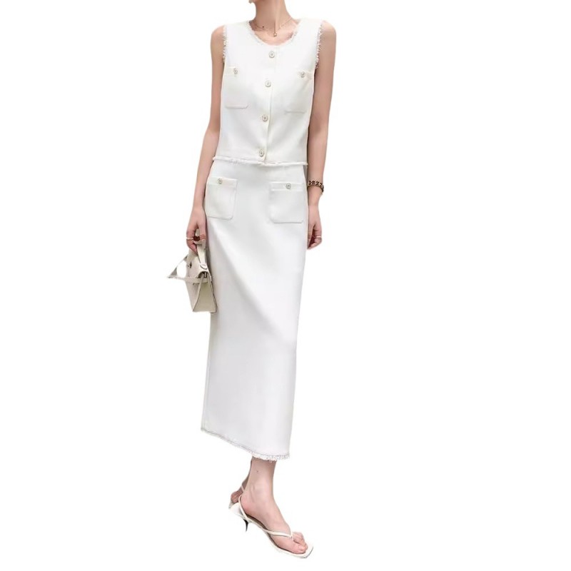 2025春秋新款白色小香风高腰半身裙套装两件套女无袖背心马甲上衣