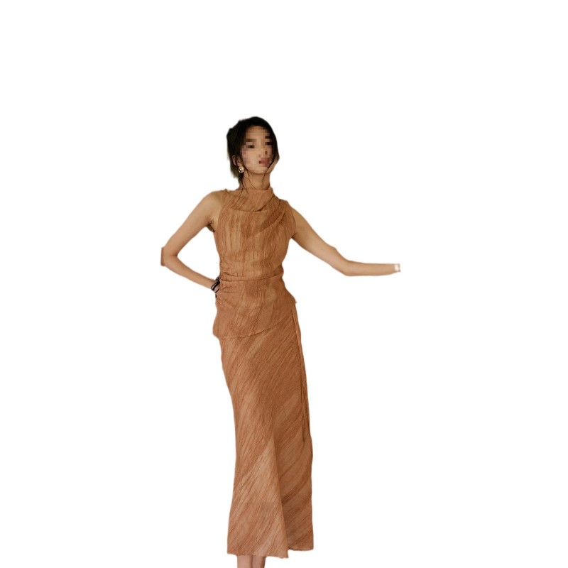 2025名媛设计感上衣半裙两件套脏橘色不对称堆堆领背心半身裙套装