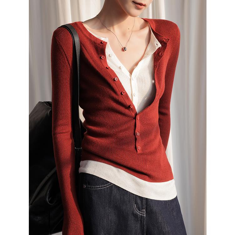 2025年春秋新款修身显瘦上衣法式名媛红色V领长袖假两件针织衫女